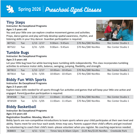 View our Recreation Guide for upcoming events and classes: https://www.antiochca.gov/fc/recreation/RecGuide.pdf
